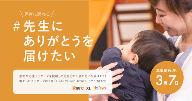 行事や参加日の中止・規模縮小も多かった今年度は、日々お世話になっている先生方に感謝を直接伝えられる機会も減ってしまいました。卒園・進級の時期を迎えた今、保育業界に関わるもの※としてたくさんの「ありがとう」を伝える機会を提供したいと考え、この度、全国100万人の「はいチーズ!」ユーザーをはじめ、幼児の保護者の皆さんの声を募ることにしました。