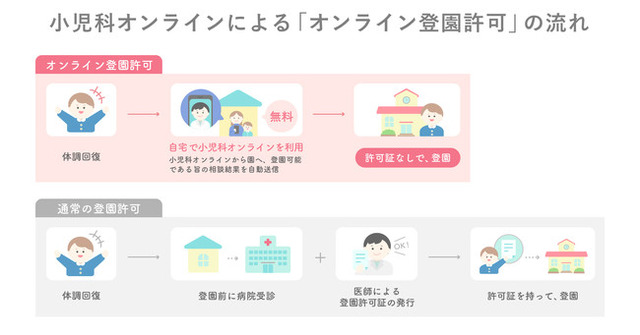 株式会社ウィズチャイルドが運営する保育園の園児の保護者は無料で「小児科オンライン」を利用でき、相談時に小児科医が伝えたアドバイスは希望に応じて園に連携されます。登園を迷う保護者は自宅から、登園前夜にオンラインで登園の可否を含めたアドバイスを受けることができ、問題がなければ登園前翌朝の受診が不要となります。十分回復していると判断され「翌日の登園は問題ないと思います」という小児科医からのコメントがあった場合、保育園はその情報連携をもって登園許可とみなします。