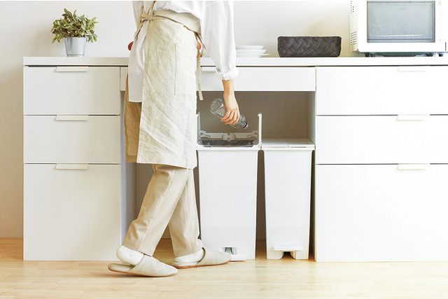 棚やカウンターの下など高さがない場所に置けて、そのままゴミが捨てられます。家具の下にぴったり収まるのでキッチン環境もすっきり整います。直線的なデザインはインテリアを選ばず、さりげなく空間になじみます。