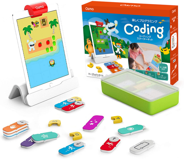「Osmo コーディング スターターキット」(11,800円・税別)は、iPadと付属のブロックを使って、3種類のゲームで段階的にプログラミングのスキルを身につけられます。