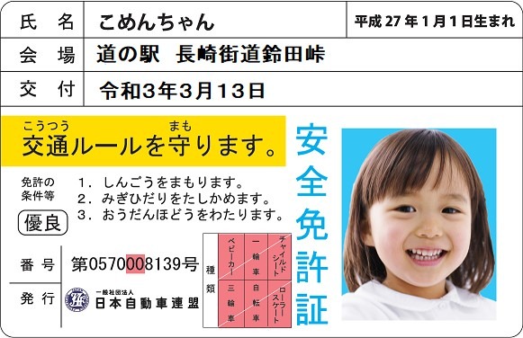 今回は道の駅長崎街道鈴田峠に交通安全ブースを出展し、交通安全クイズに答えると運転免許証そっくりのカードを発行する「子ども安全免許証」やJAFオリジナルミニカーの販売もいたします。また、当日開催されている「道の駅長崎街道鈴田峠 春のイキイキ健活まつり」では、新鮮野菜や地元高校パティシエ科によるスイーツ販売や健活ブース内で血管年齢測定会等、 健康のチェックもおこなわれており、JAFのブース以外でもいろいろな展示をお楽しみいただけます。
