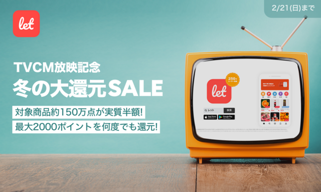 株式会社レット(本社:東京都港区、代表:佐藤 航陽)が運営する、訳あり品/食品ロス削減のマーケット「Let(レット)」は2/20(土)からオンエアを開始する新TVCMの放映を記念し「冬の大還元SALE」を2月19日(金)18:00より開催いたします。期間中に対象商品をご購入いただくと、一回あたり2,000ポイントを上限に購入金額の50%をポイント還元いたします。期間中のご購入であれば、ポイント還元はお一人様あたり何度でもご利用いただけます。