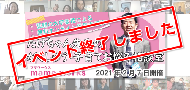 在宅ワーク特化型求人サイト『ママワークス(R)』が2021年2月7日に開催した無料オンラインワークショップ「たけちゃん先生のがくしゅう・子育てお悩み相談室」は、親御様だけでなくお子様も参加いただき、総勢52名というたくさんの皆様とともに盛況のうちに終了いたしました。
