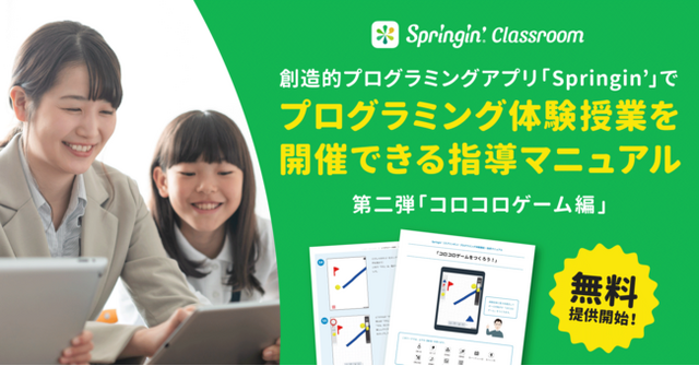 株式会社しくみデザイン(本社:福岡市博多区、代表取締役:中村 俊介、以下「しくみデザイン」)は、全国の学習塾、各種教室・小学校などへ向けて、自社で開発する創造的プログラミングアプリ「Springin'(スプリンギン)」でゲームをつくりながらプログラミング体験ができる授業を運営・指導するためのマニュアル「Springin'プログラミング体験授業/運営・指導マニュアル(コロコロゲーム編)」を無料提供いたします。