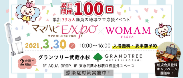 2021年3月30日(火) 10:00~16:00 「ママハピEXPO×WOMAMフェスタ@グランツリー武蔵小杉」