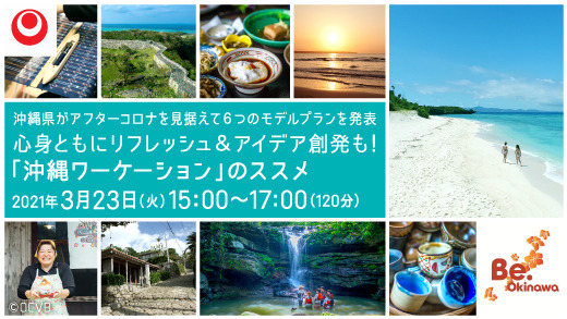 その一環として、この度、3月23日(火)15:00より、沖縄ワーケーションの魅力やモデルプランを発表する無料ウェビナー『~沖縄県がアフターコロナを見据えて6つのモデルプランを発表~心身ともにリフレッシュ&アイデア創発も!「沖縄ワーケーション」 のススメ』を開催しました。