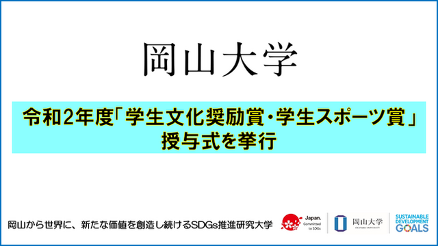 国立大学法人岡山大学(本部:岡山市北区、学長:槇野博史)は、令和2年度「学生文化奨励賞・学生スポーツ賞」授与式を3月24日、創立五十周年記念館で挙行し、個人の部16人・団体の部1団体を表彰しました。