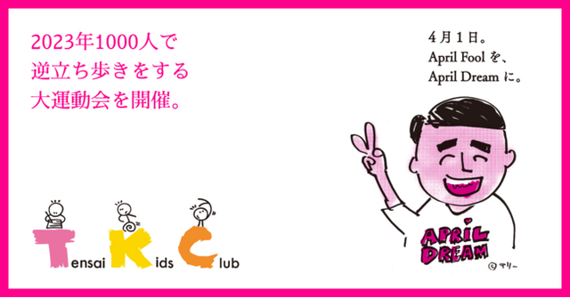 当社は、「April Dream 4月1日は、夢の日。」に参加しています。このプレスリリースは「天才キッズクラブ」のApril Dreamです。神奈川を中心に17の保育園と学童/課外教室、天才キッズクラブ(http://www.tensaikids.jp/)を運営する株式会社TKC(本社:東京都稲城市 代表:田中孝太郎)は、2023年に1000人で逆立ち歩きをする大運動会を開催。日本中の大人と子どもたちを元気にしたい、という想いを胸に世界一ワクワクする保育園を目指します。