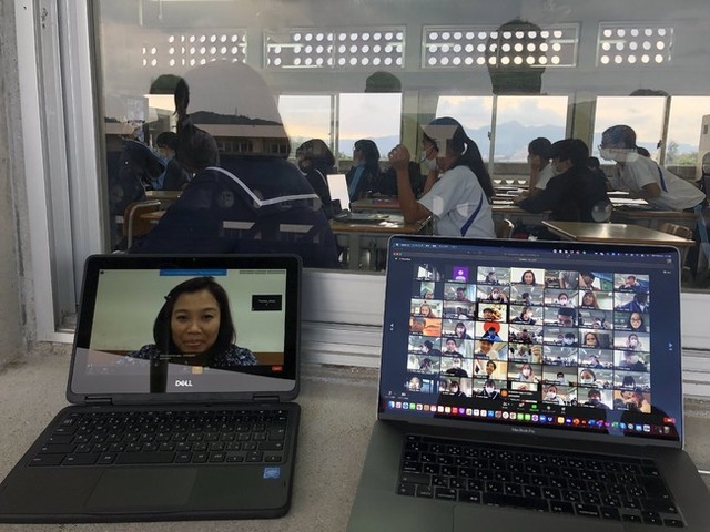 授業は1時間沖縄の中学生とタイの大学生が、英語を共通言語として交流をはかるものです。沖縄の紹介、タイの紹介をそれぞれ考え、英語でプレゼンテーションを実施。最後はクイズを出しながらコミュニケーションをはかりました。