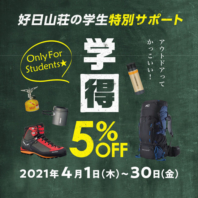 好日山荘メンバーズ会員で学生の方は、店頭で学生証をご提示いただくと、店内在庫商品(一部商品を除く)が、レジにて5%OFFとなります。