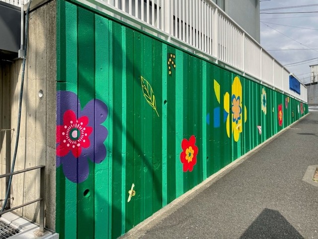 壁画のデザインは、横浜美術大学助手の下鳥日那子さんが担当しました。郵便局という場所から、「思いを届ける」ことをイメージした紙飛行機や、緑豊かな青葉台でたくさんの笑顔が咲くように願いを込めて花とミツバチをデザインしています。ミツバチは、青葉台郵便局の屋上で、本施設の開業を契機に2021年3月から活動を開始した地元有志による養蜂事業「青葉台ハニービープロジェクト」との連携も踏まえたデザインとなっています。