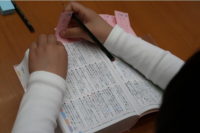 後半が始まり、先生が手順を伝えていくと、お子さんたちは自分の知っている言葉を探して、どんどんふせんに書き、どんどん辞書に貼り付けていき、時間内にそれぞれ70ほどの言葉を見つけていました。時間が終わってからも夢中になって学習を続けていました。