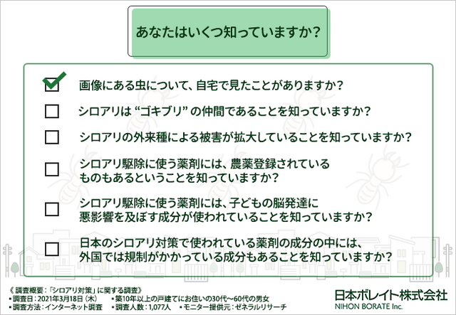 日本ボレイト株式会社(本社所在地:東京都千代田区、代表取締役:浅葉 健介)は、築10年以上の戸建てにお住いの30代~60代の男女を対象に、「シロアリ対策」に関する調査を実施しました。