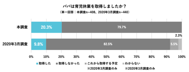パパの育児休業取得状況を質問したところ、20.3%が「パパが育児休業を取得した」と回答しました。2020年3月に実施した第1回目の「パパの育児休業」に関する調査と比較をすると、「パパが育児休業を取得した」割合は10.5%向上(2020年3月9.8%/2021年3月20.3%)していることがわかりました。