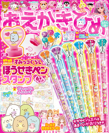 5月号の付録は「すみっコぐらし ほうせきペン6本セット&スタンプ」。カラフルで大きなジュエルがポイントの超豪華なペンと、たぴおかのかわいいスタンプのセットです。
