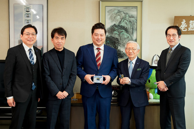 左手より、奥村秀樹/T-LAPプロジェクトリーダー(生活科学学部学部長)、大野宏之/T-LAPプロジェクトリーダー(経営情報学部准教授)、谷山詩温/当社 代表取締役、松重和美/T-LAP事業本部長(四国大学学長)、山本光憲/T-LAP事業理事(四国大学副理事長)