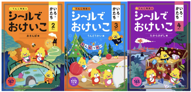 「シールでおけいこ」では、1冊を通してかわいいうんこキャラクターたちのお話でつながっていますので、最後まで飽きずに取り組むことができます。年齢に合わせた問題設定で、「総合」「かず」「もじ」「ちえ」「いろ・かたち」の各分野を楽しく学習できます。「学習ドリルはまだ早いけど……」というお子さまへの、知育学習のファーストステップとしてお使いいただけます。