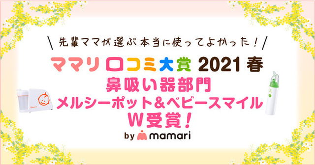 ママリ口コミ大賞2021年春~鼻吸い器部門~では、電動鼻水吸引器「メルシーポットS-503」と「ベビースマイルS-303」が2020年秋に続いて、ダブル受賞いたしました。「手放せないほどの育児グッズ」「もっと早くに買えばよかった」等々、製品に関するママのリアルな口コミも数多く寄せられています。