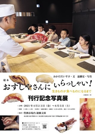 寿司職人が贈る新感覚エンタメ系写真絵本『おすしやさんにいらっしゃい!生きものが食べものになるまで』の刊行を記念した写真展が、2021年4月23日(金)より、豊洲市場 銀鱗文庫ミニギャラリーにて開催されます。