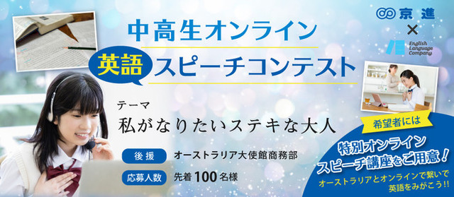 京都・滋賀・愛知を中心に全国で学習塾を展開する京進は、「京進×English Language Company 中高生オンライン英語スピーチコンテスト」を、語学学校業界における世界的な賞である「ST Star Awards」で、南半球最優秀語学学校の殿堂入りをしているオーストラリアの語学学校、「English Language Company」と共同で開催します。テーマは「私がなりたいステキな大人」。全国の中高生から英語スピーチを募集し、一次予選通過者はオンラインのコンテストで発表していただきます。