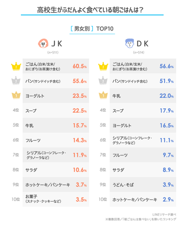 このたびLINEリサーチでは、日本全国の高校生を対象に、ふだん朝ごはんによく食べているものや学校でのお昼ご飯はどうしているのかなどについて調査しましたので、その結果をお知らせいたします。