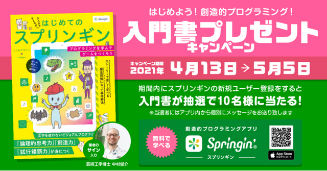 株式会社しくみデザイン(本社:福岡市博多区、代表取締役:中村俊介、以下「しくみデザイン」)は、自社で開発するプログラミング未経験でもゲーム・絵本がつくれる創造的プログラミングアプリ「Springin’(スプリンギン)」にて、期間内に新規ユーザー登録した方の中から抽選で10名様に入門書をプレゼントするキャンペーンを実施します。