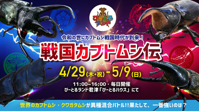千葉県・君津に開業した「びーとるランド君津」では、来る2021年4月29日(木・祝)~5月9日(日)に、甲虫たちを戦国武将に見立てて異種格闘技を行う「戦国カブトムシ伝」イベントを開催いたします。