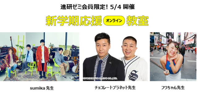 本イベントでは、進研ゼミテーマソングを担当するsumika、チョコレートプラネット(長田庄平、松尾駿)、フワちゃんなど、豪華な「先生」が登場します。