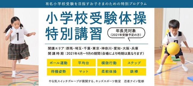 株式会社やる気スイッチグループ(東京・中央区、代表取締役社長:高橋 直司)が展開する幼児・小学生向けスポーツ教室「忍者ナイン(R)」は、私立小学校・国立小学校の2021年度の入試試験合格に向けた「小学校受験体操 特別講習」を4月25日(日)から順次開講します。このコースは2021年受験予定の年長児を対象に、私立・効率小学校受験の運動テストで出題頻度の高い運動テスト項目を抽出し、4 回の講習と 1 回の動作テストを組み合わせた6か月にわたる全5回のコースです。昨年初めて東京で2回実施し、好評につき今年は東京・神奈川・群馬・千葉・埼玉・愛知・大阪・兵庫の8都府県の合計18エリアに拡大します。東京・八丁堀エリアと神奈川・都筑区エリアは4/25(日)に初回レッスンがスタートします。