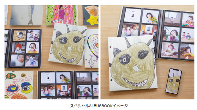 応募者の中から抽選でプレゼントする「スペシャルALBUSBOOK」は、子どもが描いた絵を表紙にプリントできる新しいアルバムで、従来のアルバム(ALBUSBOOK)と同様にお使いいただけます。