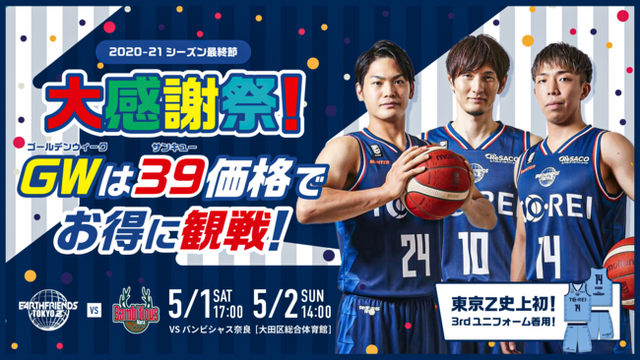 東京都の城南エリアをホームタウンに活動するBリーグ・アースフレンズ東京Zでは、5月1日(土)2日(日)に開催する「最終戦 アースフレンズ東京Z vs バンビシャス奈良」にて、大感謝祭を実施致します。