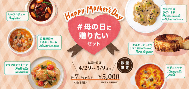 今回ECサイト限定で販売する「#母の日に贈りたいセット」は、“お母さんへの日頃の感謝を込めて、特別な食卓時間をプレゼント”がコンセプト。「リコッタのラヴィオリ~ポルチーニクリーム トリュフ風味~」や「チキンカチャトーラ」など食事で活躍するメニュー、ティータイムや食後のデザートにぴったりの「タルタ・デ・ケソ(バスク風チーズケーキ)」など全6種7パックをセットで販売します。コロナ禍で外出が難しいこの時期におうちでレストラン気分をご提案します。また、母の日専用メッセージカードをご用意しました。気軽に会えない今だからこそ伝えたい想いやなかなか伝えられない気持ちをご一緒にお届けします。