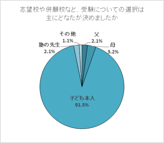 受験生の保護者に、受験に関する選択を主に行った人を聞いたところ、91.5%が「子ども本人」と回答した。多くの家庭で、子どもが主体となって、高校受験に関する選択を進めていたことが明らかとなった。
