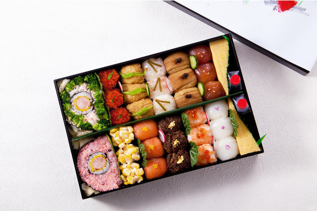 お子さまにも人気のウインナーや桜でんぶ、カニカマサラダのお寿司をお頭のイメージに、サーモンや稲荷、コーンマヨネーズなどの手毬寿司をうろこのイメージで鯉のぼりに見立て、彩りよく詰められた、節句のお祝いにふさわしいお寿司をご用意しました。