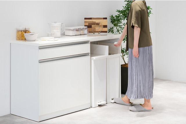 左右両開きのフタにより、開閉時の高さが抑えられるので、上部に大きな空間がないカウンター下など様々な場所に設置が可能です。