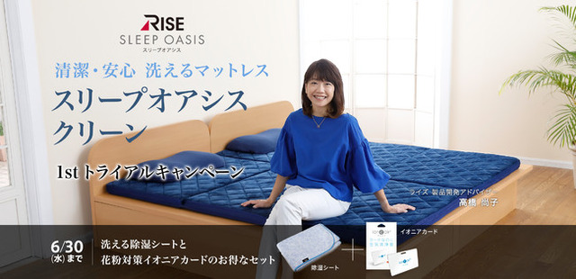 発売を記念して、2つの清潔アイテムが付いてくる「スリープオアシス クリーン 1STトライアルキャンペーン」を6月30日(水)まで、ライズ公式サイトにて開催。同時開催キャンペーンとして、1枚買うともう1枚ついてくる「スリープオアシス ドライクール 接触冷感ひんやりマットレスパッド 先行予約キャンペーン」を、5月18日(火)まで受け付けています。
