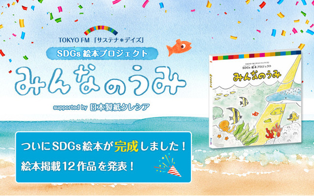 TOKYO FMで放送中の高根枝里がパーソナリティをつとめる『サステナ*デイズ』では、2015年9月に国連サミットで採択された「SDGs(持続可能な開発目標)」の“17の目標”に真摯に取り組むさまざまな企業の事業活動を応援するとともに、社会変革のアクションをサポートしながら、私たちが等身大でできるさりげないサステナブル生活のヒントを探っています。番組では1月から、「子どもたちと一緒に安心してくらせる未来を絵本にしよう!」というキャッチコピーのもと、「SDGs絵本プロジェクト『みんなのうみ』」企画を進行してきました。「SDGs」の14番目の目標である「海の豊かさを守ろう」をテーマに、子どもたちが大好きな“海”を大切にする気持ちを描いてもらい、応募で集まった絵から1冊の絵本を作成する企画です。この『みんなのうみ』を通して“ SDGsをもっと身近に感じてほしい”という番組の思いに賛同した日本製紙クレシア株式会社の協力のもと、この度ついに絵本が完成しました。多数の応募があった子どもたちの絵を、絵本作家・のぶみが物語にまとめたこの絵本の受賞作品は、番組特設ホームページで公開中です。