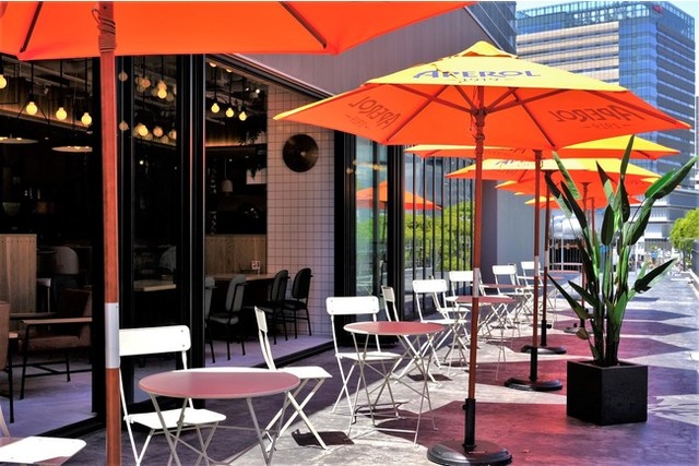 テラス席はオレンジ色のパラソルが目印。12席のテラス席はペット連れでもご利用可能でどなたでも気兼ねなくお使いいただけます。