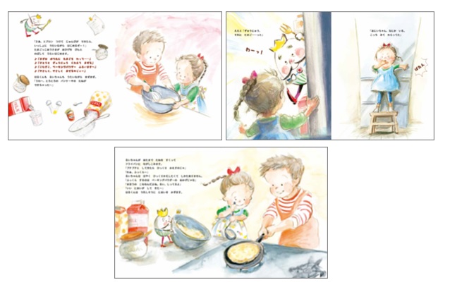 「この絵本を描き終えた翌日、早起きした娘は、エプロンをつけて、台所で私を待ち構えていました。この朝、わが家の“るいちゃん”がはじめて家族のためにパンケーキをつくってくれたのです。幸せの味がする朝食でした」