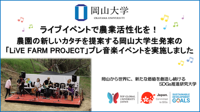 国立大学法人岡山大学(本部:岡山市北区、学長:槇野博史)は、岡山大学の学生らが自らの発案で、地元の農業活性化と文化発信を目指す企画『大自然で音を奏でるライブハウス LiVE FARM』を立ち上げ、その最初の一歩として2021年4月3日、農業法人・果樂株式会社の農園で音楽を奏でるプレイベントを開催しました。