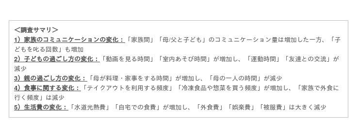 4)食事に関する変化:「テイクアウトを利用する頻度」「冷凍食品や惣菜を買う頻度」が増加、「家族で外食に行く頻度」は減少