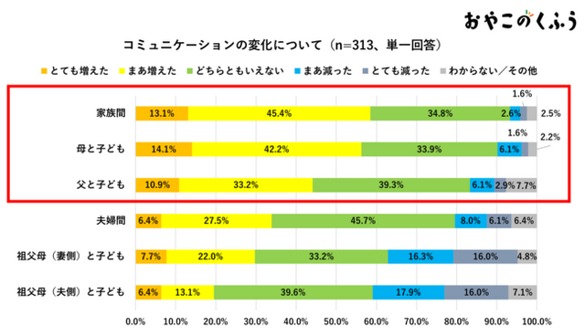 コミュニケーションの変化では、「家族間」「母と子ども」が約6割、「父と子ども」が4割以上、コミュニケーションが増加したと回答した一方、約5割は「母が子どもを叱る回数」が増加したと回答しました。また、「祖父母(妻側)と子ども」「祖父母(夫側)と子ども」のコミュニケーションにおいては、3割以上が減少したと回答しました。コロナの感染拡大により、お盆や年末年始などの休暇期間に帰省ができなかったことなどが、子どもと祖父母のコミュニケーション機会の減少に繋がっている模様です。