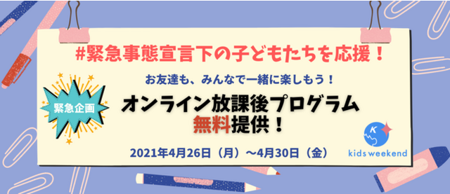 子ども向け「教育×オンライン」の分野では、日本最大級のプラットフォームである「キッズウィークエンド」を運営するキッズシーズ株式会社(本社:東京都中央区、代表取締役:三浦里江)は、3度目の緊急事態宣言発令を受けて、4月26日(月)~5月9日(日)の期間、「#緊急事態宣言下の子どもたちを応援!」キャンペーンを実施します。未就学児から小学生の子どもたちを対象とした「オンライン学童」「オンライン社会科見学」の提供を予定しており、参加費は原則無料です。