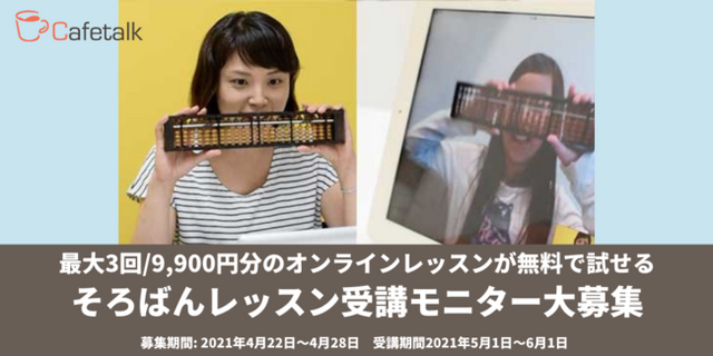 世界中の講師と生徒をつなぐオンライン習い事サイト「カフェトーク(http://cafetalk.com/)」を運営する株式会社スモールブリッジ(本社:東京都渋谷区、代表取締役:橋爪小太郎)は、2021年4月22日、カフェトークの「趣味>そろばん」カテゴリーのレッスンを最大3回無料で試せる受講モニター募集を開始しました。2021年4月28日応募締め切りとなります。