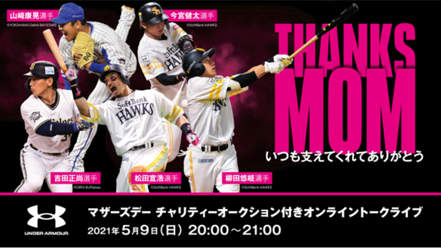 2021年5月9日(日)20時から、山崎康晃選手(横浜DeNAベイスターズ)と吉田正尚選手(オリックス・バファローズ)をゲストに迎え、母親にちなんだテーマでエピソードトークを行うオンライントークライブを、アンダーアーマー公式YouTubeチャンネルで開催します。トークライブの後半では、山崎選手と吉田選手を含む「チームUA」のメンバーが当日の試合で着用した野球アイテムを出品するオンラインチャリティーオークションを行います。