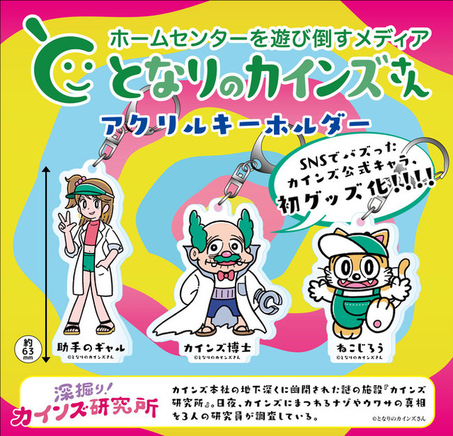 アクリルキーホルダーとして登場するのは、連載記事「深堀り!カインズ研究所」(https://magazine.cainz.com/series/3483)の人気キャラクターたち。4月28日(水)から順次、指定の店舗に設置されたカプセルトイで販売を開始いたします。