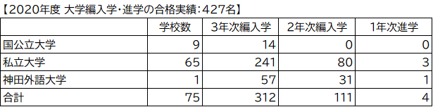 2020年度は延べ427名が大学編入学・進学試験に合格。志望する学部は、外国語学部や文学部などの語学系に留まらず、経済学部、経営学部、商学部、社会学部、国際学部、法学部など社会科学系の学部に進む学生もいます。