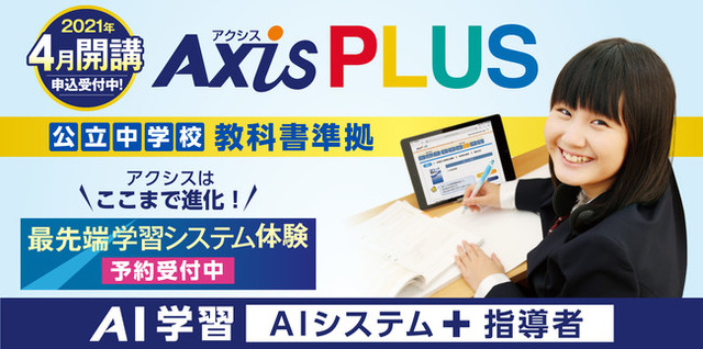 「AxisPLUS(アクシスプラス)」はワオ・コーポレーションが自社で開発した中学生を対象としたシステムで、生徒一人ひとりの学習結果を日々蓄積し、それをもとにAIが最適なカリキュラムと教材を一人ひとりに提供する最先端の自立学習システムとなっています。