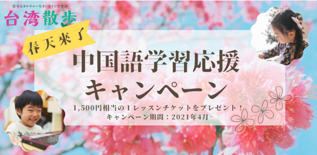 「自宅で台湾気分!」がコンセプト!期間内に料金プランへお申し込みいただくと、さらに1,650円(税込)相当の無料1レッスンチケットをプレゼントします。新生活がスタートするこの時期だからこそ、学習を始める絶好の機会。中国語を勉強してみたいけど機会がなかった、時間がなかった、そんな方を応援するキャンペーンです♪
