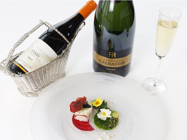 乾杯用スパークリングワイン、花束がセットされたコース料理